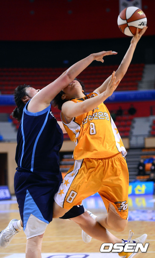 17일 오후 경산실내체육관에서 열린 'KDB금융그룹 2013 여자농구 챌린지컵' 준결승전 KB스타즈와 동아백화점의 경기, 3쿼터 KB 양선희가 동아백화점 한연호의 수비를 피해 레이업슛을 시도하고 있다.