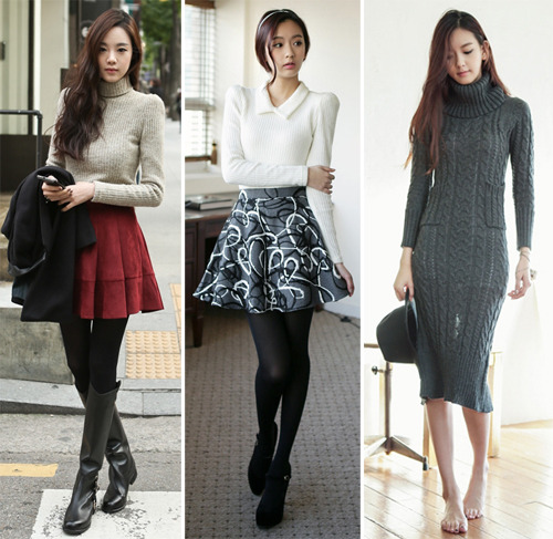 좀 더 날씬해 보이기 위해서는 너무 루스한 핏보다는 살짝 라인을 잡아주는 슬림한 핏에 세로꽈배기 패턴이 있어 시선이 아래로 길게 내려오는 디자인을 입는 것이 현명하다. 하지만 몸매가 통통해 슬림한 핏이 부담스러운 이들은 허리라인은 살짝 잡아주고 힙부터 퍼지는 A라인을 입는 것이 좋다. 그래야 허리가 날씬하게 강조돼 전체적으로 통통해 보이는 것을 막을 수 있다.