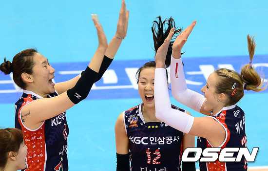 17일 오후 대전 충무체육관에서 열린 '2012-2013 NH농협 V-리그' 여자부 인삼공사와 흥국생명의 경기 2세트 한수지와 케이티가 하이파이브를 하고 있다.