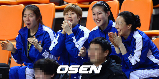 17일 오후 경산실내체육관에서 열린 'KDB금융그룹 2013 여자농구 챌린지컵' 준결승전 삼성생명과 KDB생명의 경기, 삼성생명 홍보람, 고아라, 박정은, 이미선이 관중석에 앉아 동료들을 응원하고 있다.