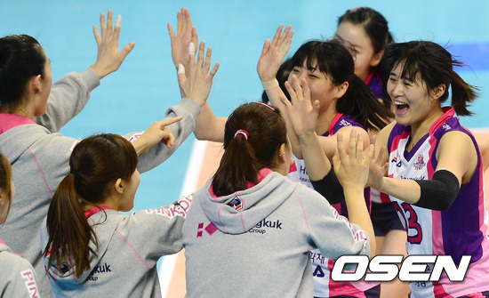 17일 오후 대전 충무체육관에서 열린 '2012-2013 NH농협 V-리그' 여자부 인삼공사와 흥국생명의 경기 종료 후 흥국생명 선수들이 승리를 기뻐하고 있다.