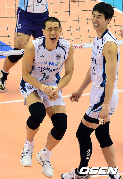 17일 오후 대전 충무체육관에서 열린 '2012-2013 NH농협 V-리그' 남자부 삼성화재와 대한항공의 경기 1세트 삼성화재의 공격이 막히자 고희진이 아쉬워하고 있다.