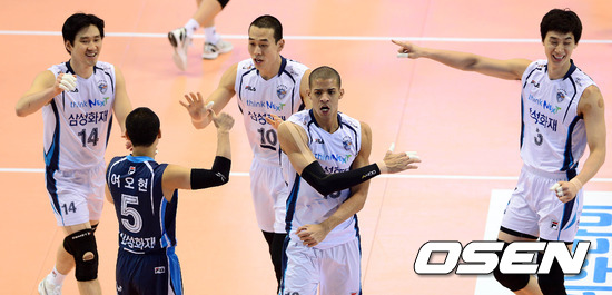 17일 오후 대전 충무체육관에서 열린 '2012-2013 NH농협 V-리그' 남자부 삼성화재와 대한항공의 경기 1세트 삼성화재가 득점 후 선수들이 환호하고 있다.