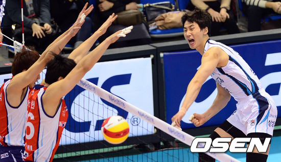 17일 오후 대전 충무체육관에서 열린 '2012-2013 NH농협 V-리그' 남자부 삼성화재와 대한항공의 경기 2세트 삼성화재 박철우가 스파이크를 날리고 있다.