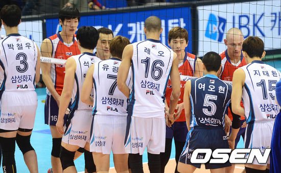 17일 오후 대전 충무체육관에서 열린 '2012-2013 NH농협 V-리그' 남자부 삼성화재와 대한항공의 경기 종료 후 선수들이 악수를 나누고 있다.