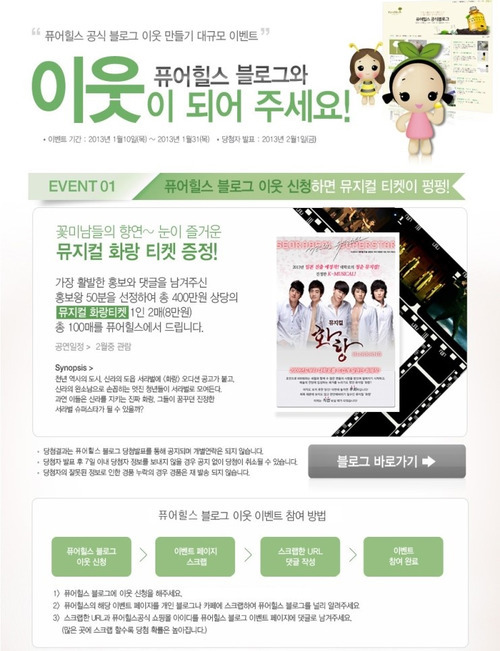이벤트 참여자 중 가장 활발한 홍보를 한 50명에게는 뮤지컬 '화랑' 초대권 2매를 증정한다. 당첨자는 2월 1일 퓨어힐스 공식블로그를 통해 발표된다.