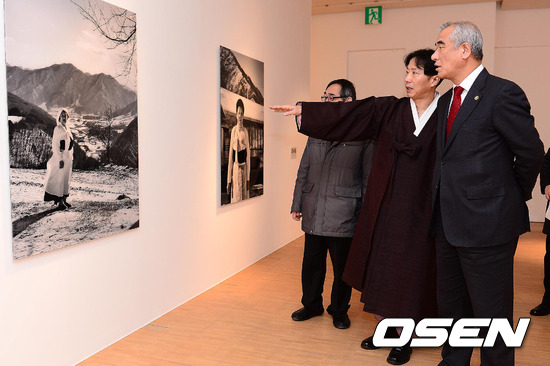 최광식 문화관광부 장관이 18일 오후 서울 강남구 신사동 메종 에르메스 도산파크 갤러리 아뜰리에 에르메스에서 사진작가 겸 전통 음악 프로듀서 김영일 작가의 '귀한 사람들' 전에 참석, 전시사진을 감상하고 있다.