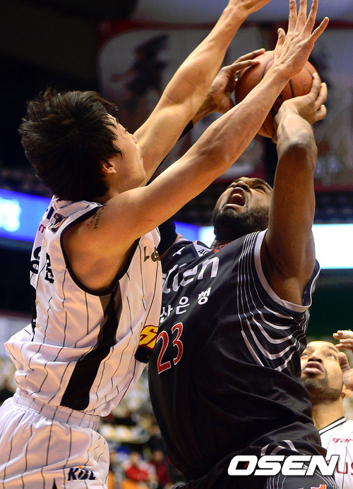 18일 오후 부산 사직실내체육관서 열린 'KB 국민카드 2012-2013 프로농구' 부산 KT와 창원 LG의 경기, 1쿼터 KT 존슨이 LG 김영환의 슛블록을 피해 점프슛을 시도하고 있다.