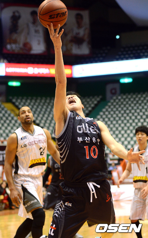 18일 오후 부산 사직실내체육관서 열린 'KB 국민카드 2012-2013 프로농구' 부산 KT와 창원 LG의 경기, 1쿼터 KT 조성민이 LG 클라크의 반칙에 걸려 넘어지면서 슛을 시도하고 있다.