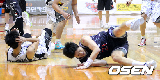 18일 오후 부산 사직실내체육관서 열린 'KB 국민카드 2012-2013 프로농구' 부산 KT와 창원 LG의 경기, 1쿼터 KT 오용준과 LG 정창영이 루즈볼을 잡으려다 충돌해 코트에 넘어지고 있다.