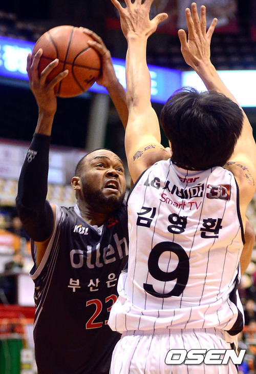 18일 오후 부산 사직실내체육관서 열린 'KB 국민카드 2012-2013 프로농구' 부산 KT와 창원 LG의 경기, 1쿼터 KT 존슨이 LG 김영환의 슛블록을 피해 점프슛을 시도하고 있다.