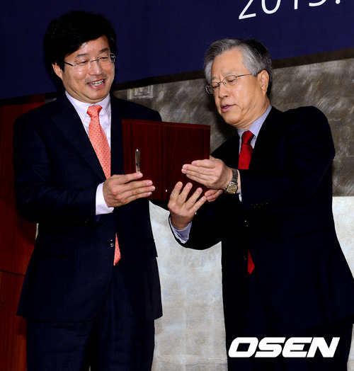 돔구장 건축을 선언한 염태영 수원시장(왼쪽)과 이석채 KT 회장