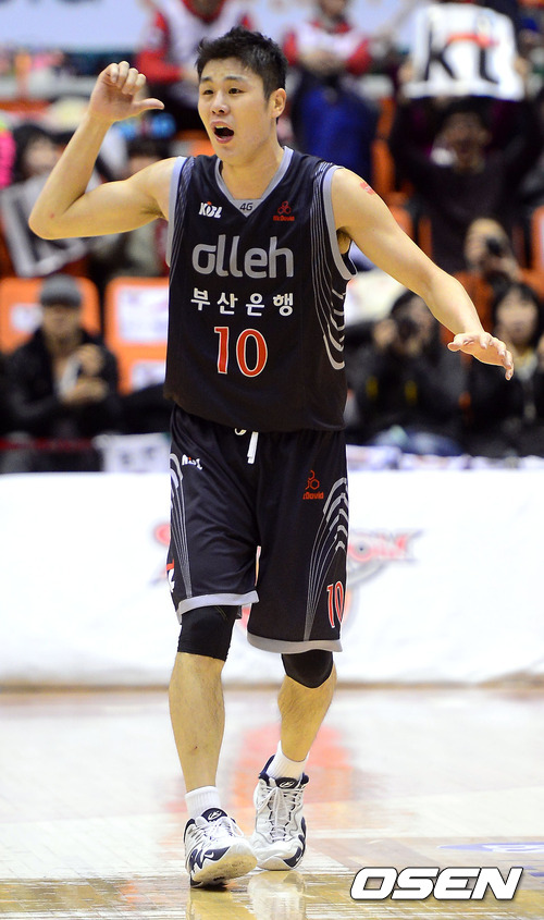18일 오후 부산 사직실내체육관서 열린 'KB 국민카드 2012-2013 프로농구' 부산 KT와 창원 LG의 경기, 2쿼터 KT 조성민이 3점슛을 시킨 뒤 동료들에게 백코트 지시를 하고 있다.