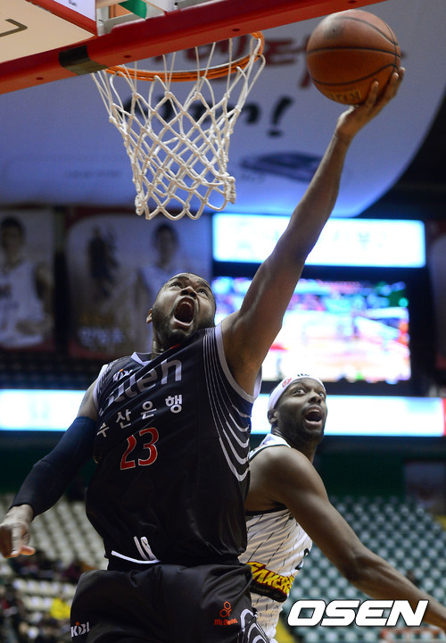 18일 오후 부산 사직실내체육관서 열린 'KB 국민카드 2012-2013 프로농구' 부산 KT와 창원 LG의 경기, 2쿼터 KT 존슨이 LG 벤슨의 슛블록을 피해 레이업슛을 시도하고 있다.