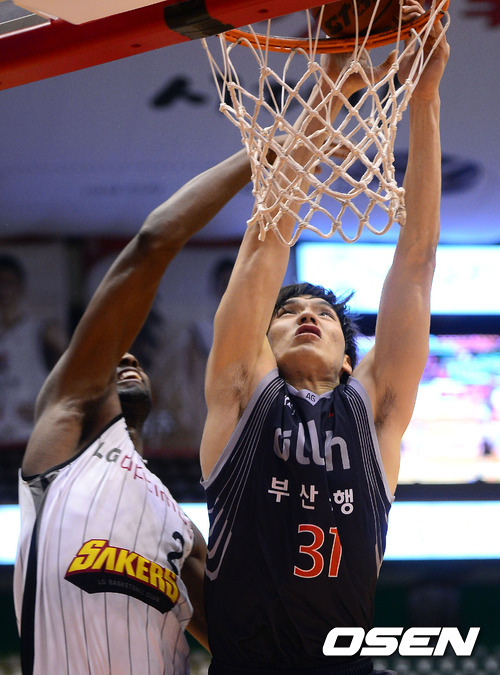 18일 오후 부산 사직실내체육관서 열린 'KB 국민카드 2012-2013 프로농구' 부산 KT와 창원 LG의 경기, 2쿼터 KT 장재석이 덩크를 시도하고 있다.