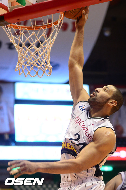 18일 오후 부산 사직실내체육관서 열린 'KB 국민카드 2012-2013 프로농구' 부산 KT와 창원 LG의 경기, 3쿼터 LG 클라크가 덩크슛을 시도하고 있다.