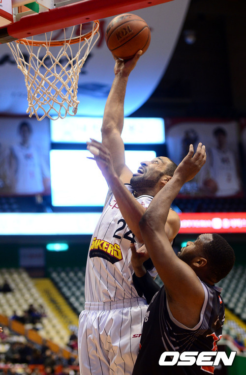 18일 오후 부산 사직실내체육관서 열린 'KB 국민카드 2012-2013 프로농구' 부산 KT와 창원 LG의 경기, 4쿼터 LG 클라크가 KT 존슨의 수비를 뚫고 골밑슛을 시도하고 있다.