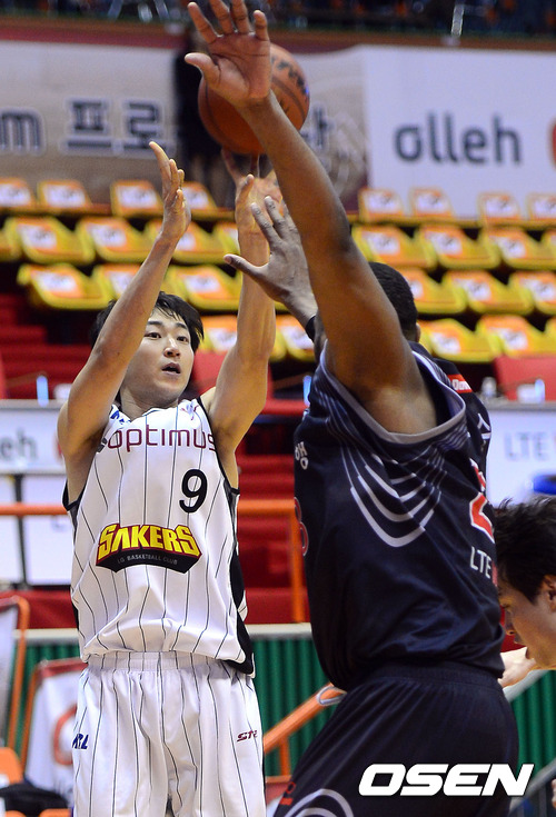 18일 오후 부산 사직실내체육관서 열린 'KB 국민카드 2012-2013 프로농구' 부산 KT와 창원 LG의 경기, 4쿼터 LG 김영환이 KT 존슨의 슛블록을 피해 점프슛을 시도하고 있다.
