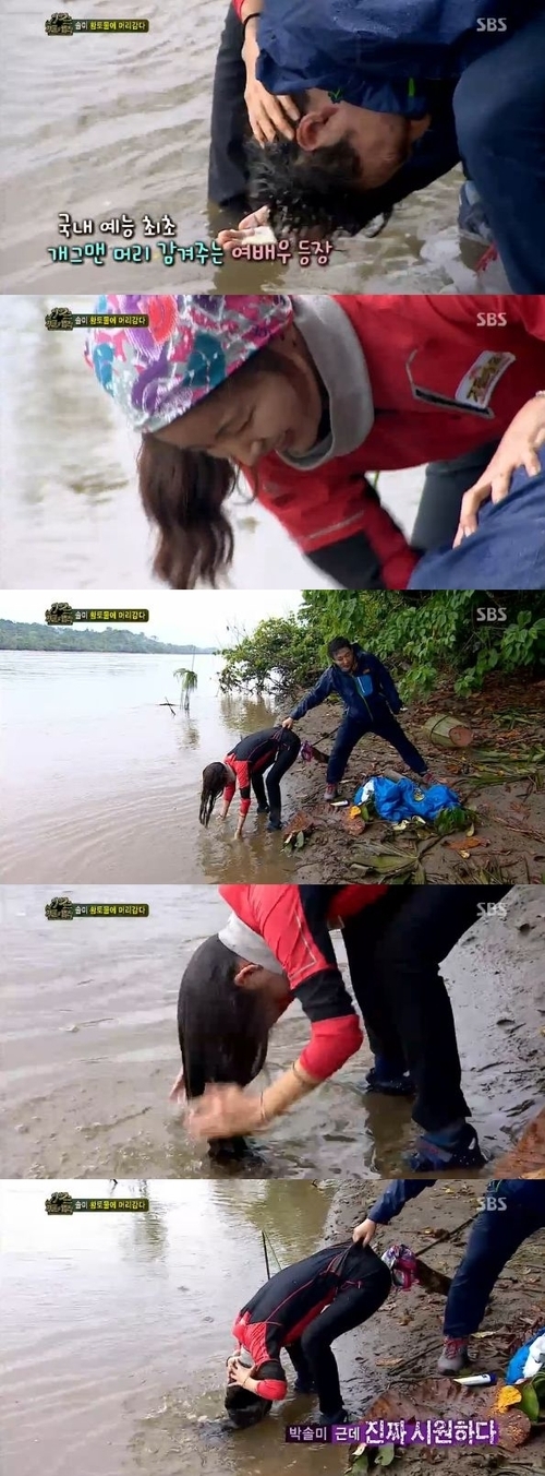 '정글의 법칙'의 박솔미가 아마존 강물에 노우진의 머리를 감겨줬다.