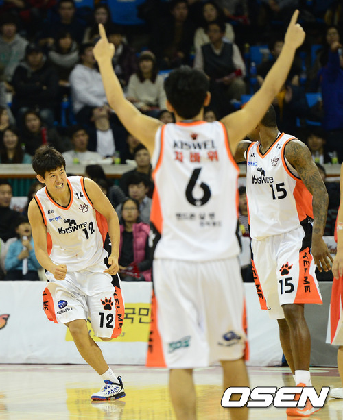 19일 오후 잠실학생체육관에서 열린 'KB 국민카드 2012-2013 프로농구' 서울 SK와 인천 전자랜드의 경기, 3쿼터 전자랜드 한정원이 3점슛을 성공시키고 환호하고 있다.