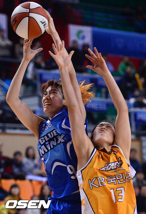 19일 오후 경산실내체육관에서 열린 'KDB금융그룹 2013 여자농구 챌린지컵' 결승전 삼성생명과 KB스타즈의 경기, 1쿼터 삼성생명 양지영과 KB 김가은이 리바운드 다툼을 벌이고 있다.