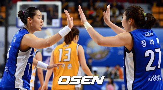19일 오후 경산실내체육관에서 열린 'KDB금융그룹 2013 여자농구 챌린지컵' 결승전 삼성생명과 KB스타즈의 경기, 3쿼터 삼성생명 이선화와 정아름이 득점을 올린 뒤 하이파이브를 하고 있다.