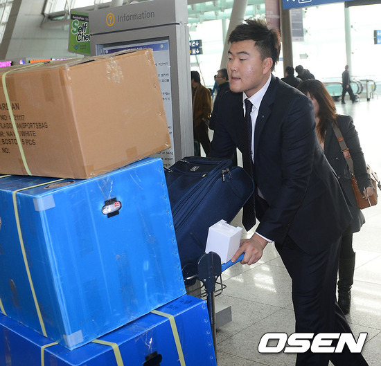두산 오재일이 짐을 끌고 공항 카운터에 들어서고 있다