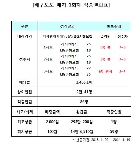 국민체육진흥공단이 발행하는 체육진흥투표권 수탁사업자인 스포츠토토(www.sportstoto.co.kr)는 지난 19(토)일 열린 2012-2013 프로배구 V리그 러시앤캐시와 LIG손해보험의 경기를 대상으로 시행한 배구토토 매치 1회차 게임에서 총 86명의 적중자가 나와 각각 베팅 금액의 1,465.1배에 해당하는 적중상금을 받게 됐다고 밝혔다.