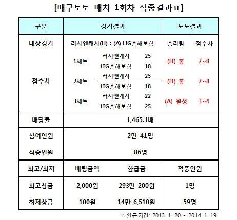 [배구토토] 국민체육진흥공단이 발행하는 체육진흥투표권 수탁사업자인 스포츠토토(www.sportstoto.co.kr)는 지난 19일 열린 2012-2013 프로배구 V리그 러시앤캐시와 LIG손해보험의 경기를 대상으로 시행한 배구토토 매치 1회차 게임에서 총 86명의 적중자가 나와 각각 베팅 금액의 1465.1배에 해당하는 적중상금을 받게 됐다고 밝혔다.