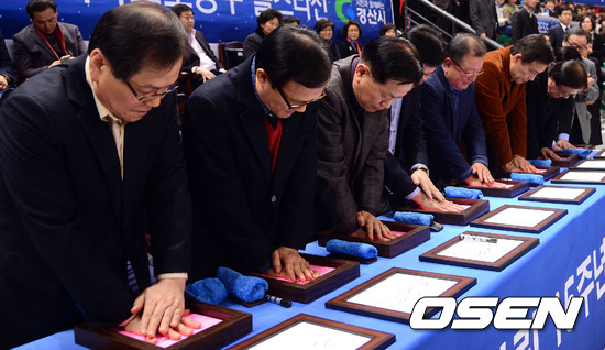 20일 오후 경산 실내체육관에서 열린 'KDB금융그룹 2012-2013 여자농구 올스타전' 경기에서 앞서 WKBL 최경환 총재와 KDB 강만수 회장 등 각 구단 관계자들이 핸드 프린팅을 하고 있다.