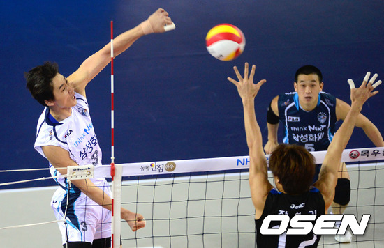 20일 오후 천안 유관순체육관에서 열린 '2012-2013 NH농협 V-리그' 남자부 현대캐피탈과 삼성화재의 경기, 2세트 삼성화재 박철우가 현대캐피탈의 블록킹 벽을 피해 스파이크를 날리고 있다.