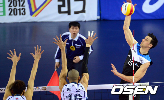 20일 오후 천안 유관순체육관에서 열린 '2012-2013 NH농협 V-리그' 남자부 현대캐피탈과 삼성화재의 경기, 1세트 현대캐피탈 가스파리니가 삼성화재의 블로킹 벽을 피해 스파이크를 날리고 있다.