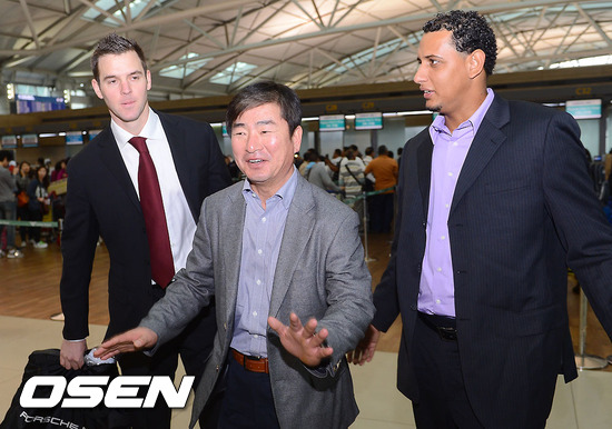 삼성 류중일 감독이 새 용병 아네우리 로드리게스와 릭 밴덴헐크와 포즈를 취하고 있다