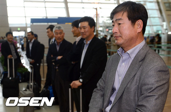 삼성 류중일 감독이 선수들의 출국 수속을 지켜보고 있다.