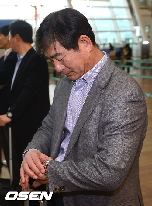 삼성 류중일 감독이 선수들의 출국 수속을 지켜보고 있다.