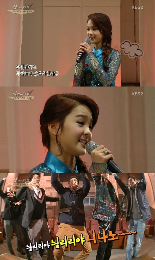 이제 고등학교 1학년이 되는 송소희는 이날 일곱명의 멤버들 앞에서 '군밤타령', '태평가' 등의 민요를 불렀다.