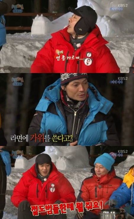 라면을 끓이던 맏형 김승우는 새 PD에 “이가 얼었다. 라면을 잘라먹게 식용 가위를 달라”고 주문했다. 이에 뭔가 이상한 낌새를 눈치 챈 새 PD는 라면이 끓고 있는 냄비를 열었고 그 안에서 김치를 발견, “절도범들한테 뭘 줘”라고 말해 웃음을 자아냈다.