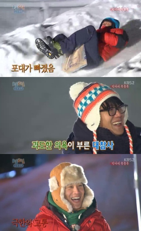 이날 멤버들은 포대를 이용해 썰매를 타고 누가 더 멀리 나가는지를 겨루는 대결을 했다. 그 동안 전통놀이 종목에서 강세를 보였던 이수근은 과도한 욕심에 포대가 빠지는 굴욕을 겪었고 멤버들은 “밑장빼기 아니냐”고 말해 웃음을 자아냈다.