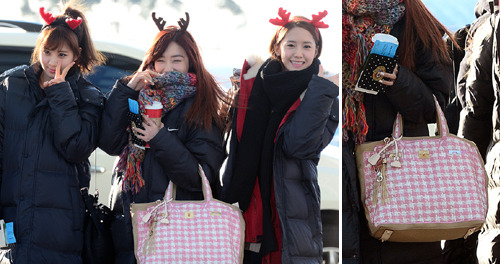소녀시대 티파니는 공항패션에서 V브랜드의 핑크 빛 숄더백을 포인트로 연출했다. 따라서 검은색 롱 패딩으로 가려진 특유의 로맨틱한 소녀 감성을 엿볼 수 있던 좋은 예. 숄더 백이 주는 캐주얼하면서도 편안한 분위기 때문에 이지 캐주얼 공항 패션이 완성됐다.