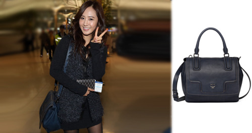 소녀시대 유리는 공항패션에서 M브랜드의 네이비 컬러의 숄더백을 포인트로 연출했다. 그가 선택한 가방은 기본적인 가죽 숄더백 스타일이다. 여기에 다크 그레이톤의 퍼 베스트와 블랙 미니 원피스를 매치하며, 모던하면서도 페미닌한 룩을 연출했다.