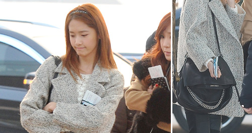 소녀시대 윤아는 공항패션에서 J브랜드의 실버 체인이 돋보이는 블랙 숄더 백을 착용했다. 특별하게 신경쓰지 않은 듯 내추럴한 디자인이 눈길을 끌며, 오버사이즈 핏의 코트와 매치하여 여대생 느낌이 나는 캐주얼한 공항패션을 완성했다.