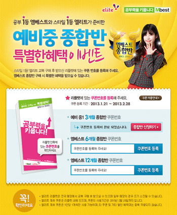 전국 엘리트 매장에서 교복 구매 시 제공되는 리플렛 안쪽에는 엠베스트 예비 중1 종합반 구매 시 사용할 수 있는 특별 쿠폰이 들어 있다. 엠베스트 홈페이지를 방문해 쿠폰 번호를 등록하면 종합반 강좌 구매 시 특별한 수강 할인 혜택을 받을 수 있다. 쿠폰의 등록 기간은 2월 28일까지이다.