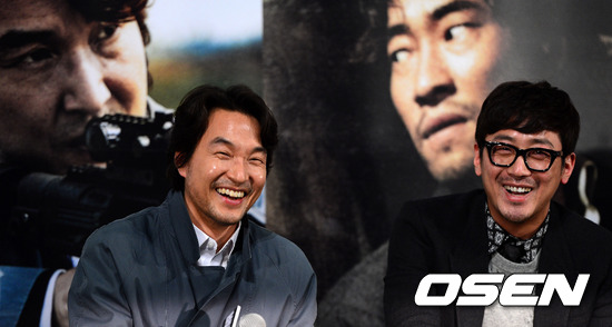 한석규, 하정우가 질문에 답을 하며 미소짓고 있다.
