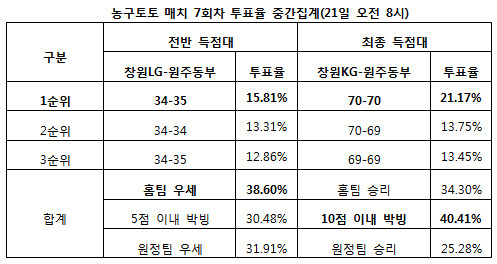 홈팀 창원LG의 승리를 예상한 참가자는 34.30%로 집계됐고, 원주동부의 승리를 예상한 참가자는 25.28%로 집계 되었다.