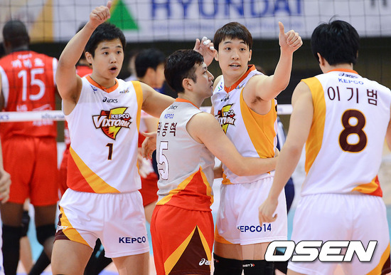 22일 오후 경기도 수원시 수원체육관서 열린 '2012-2013 NH농협 V-리그' KEPCO와 LIG의 경기 2세트 KEPCO 양준식이 득점 성공 후 동료들과 기뻐하고 있다