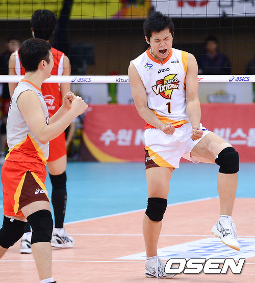 22일 오후 경기도 수원시 수원체육관서 열린 '2012-2013 NH농협 V-리그' KEPCO와 LIG의 경기 4세트 KEPCO 서재덕이 득점 성공후 환호하고 있다
