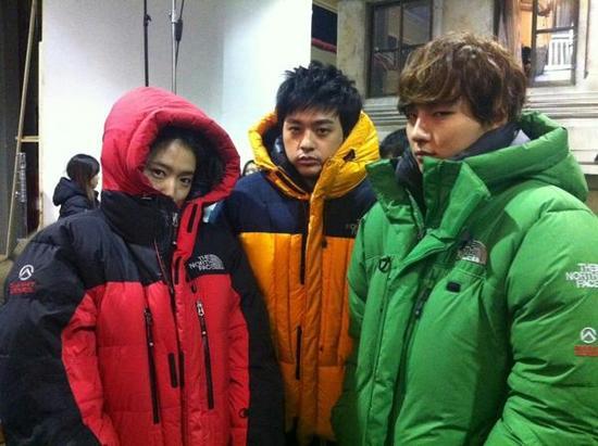 사진 속에는 '이웃집 꽃미남'의 세 주인공 박신혜, 김지훈, 윤시윤이 각각 빨간색, 노란색, 초록색의 패딩 점퍼를 입고 나란히 서있다. 알록달록 배색을 맞춘듯한 의상과 추운 날씨 탓에 잔뜩 움츠린 채 카메라를 노려보고 있는 배우들의 장난기 섞인 표정이 웃음을 자아내는 모습이다.