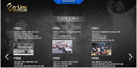 『On-Line MUSEUM』의 첫 번째 섹션은 한국에 야구가 도입된 기원과 프로야구의 역사를 시대별로 정리했으며, 두 번째 섹션에서는 프로야구가 탄생한 82년부터 실시된 한국시리즈와 골든글러브를 영상과 사진을 통해 생생하게 만나볼 수 있다. 또한 프로야구를 빛낸 레전드올스타 10명의 선수와 불멸의 기록도 함께 소개한다.