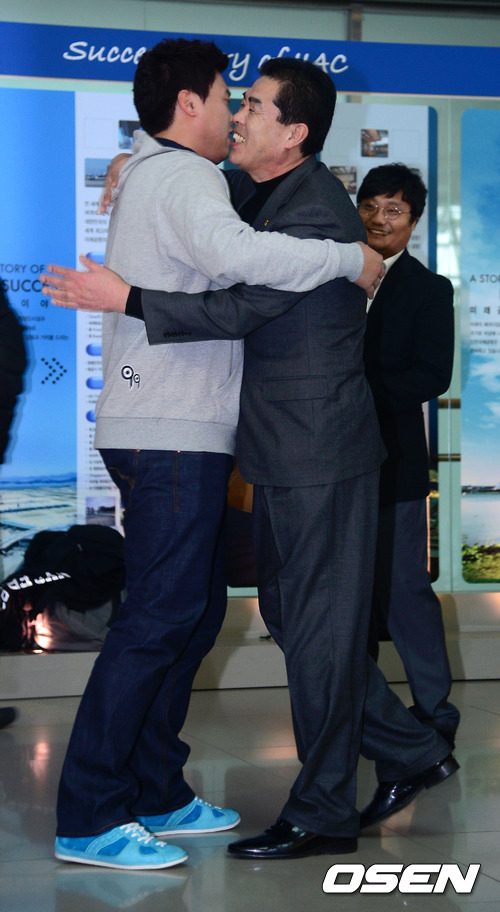출국에 앞서 류현진이 아버지 류재천씨와 포옹을 하고 있다.