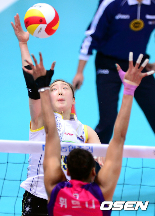 23일 오후 인천 도원체육관에서 열린 '2012-2013 NH농협 V-리그' 여자부 흥국생명과 도로공사의 경기, 2세트 도로공사 황민경이 흥국생명 휘트니의 슛블록을 피해 대각선 공격을 시도하고 있다.